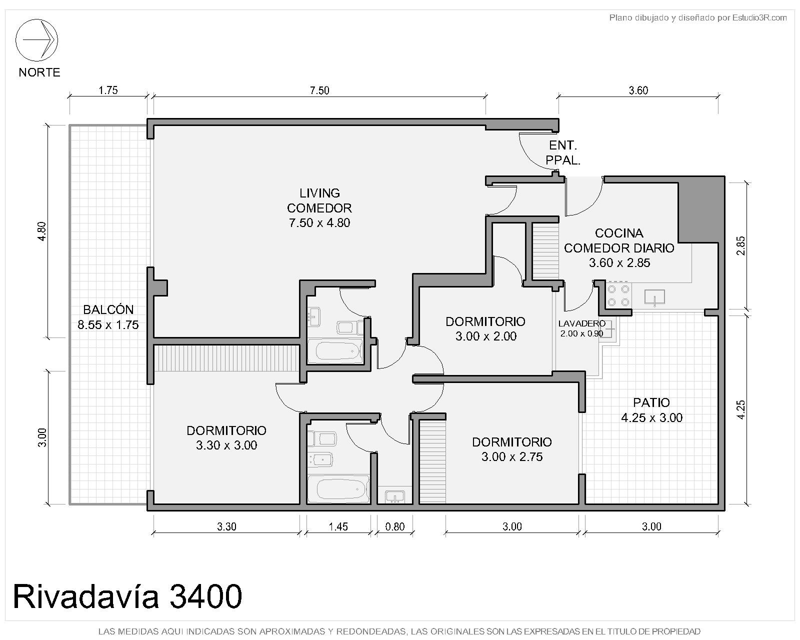Departamento en venta con cochera y patio. Al ingresar, el hall distribuye hacia la cocina con comedor diario y, en paralelo, al living-comedor con salida al balcón corrido. Desde el living se accede al pasillo que organiza tres dormitorios y dos baños. Un dormitorio conecta con el patio y otro con el balcón corrido. El lavadero se accede desde la cocina. Toda la información del aviso, incluyendo medidas, precio, impuestos, servicios, etc. son estimativos, sujetos a modificación y no vinculantes, según lo dispuesto en el art. 973, Cód. Civ. y Com.
